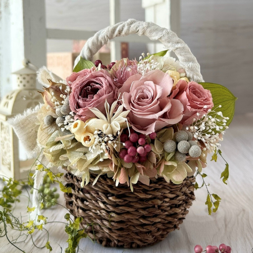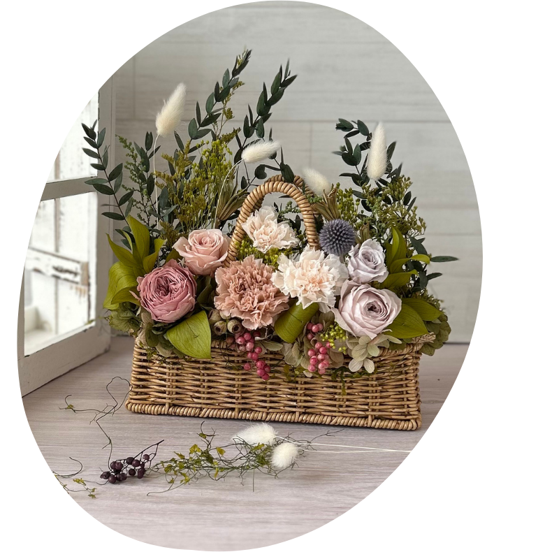 プリザーブドフラワーのアレンジメントには造花を一切使用しません。自然素材だけにこだわり、本物だけが持つ、時を重ねて深まる風合いを大切にしています。