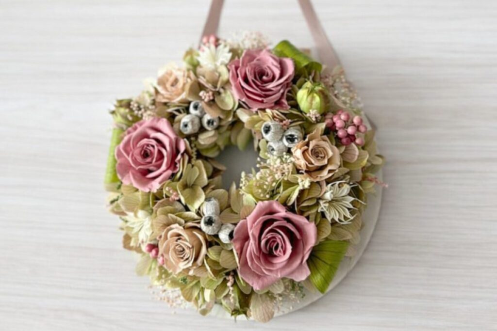 花がもたらす彩りや癒しの力に魅了され、その後在宅でアーティフィシャルフラワー制作の仕事に従事。リースやアレンジメント制作を重ねながら専門的に学び、技術を深め、現在はプロとして活動しております。